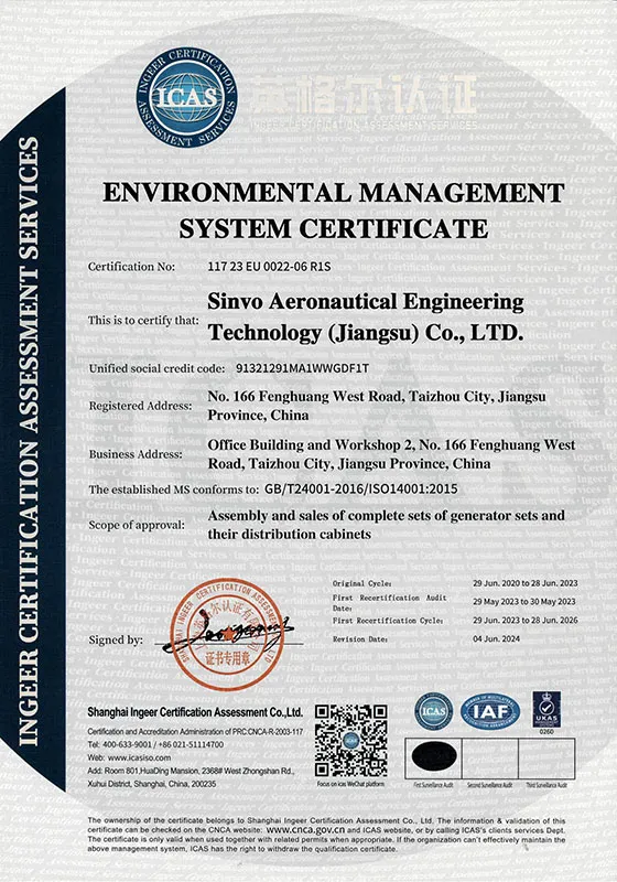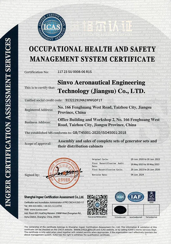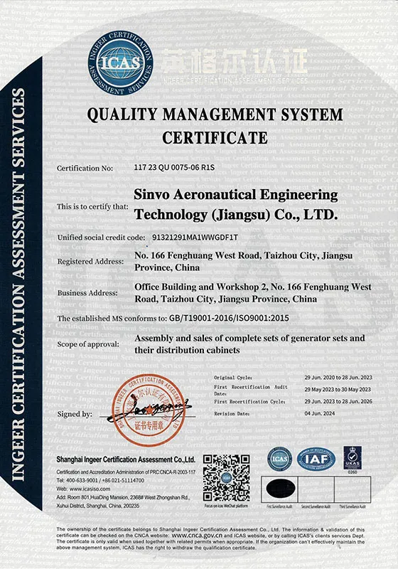 В процессе быстрого и стабильного развития компания Синьво последовательно прошла сертификацию по следующим международным и национальным стандартам: система менеджмента качества ISO 9001, система экологического менеджмента ISO 14001, система менеджмента профессиональной безопасности и здоровья ISO 45001, сертификация услуг GB/T 27922 и сертификация системы качества по национальному военному стандарту. Продукция Синьво широко применяется в таких отраслях, как связь, энергетика, гражданская авиация, здравоохранение, скоростные автомагистрали, нефтегазовая и нефтехимическая промышленность, оборона, металлургия и военно-промышленный комплекс. Компания обладает рядом патентов на дизель-генераторные установки и сопутствующее оборудование, постоянно стремится к оптимизации всех систем агрегатов и стабильности их характеристик, максимально повышая надёжность для пользователей.